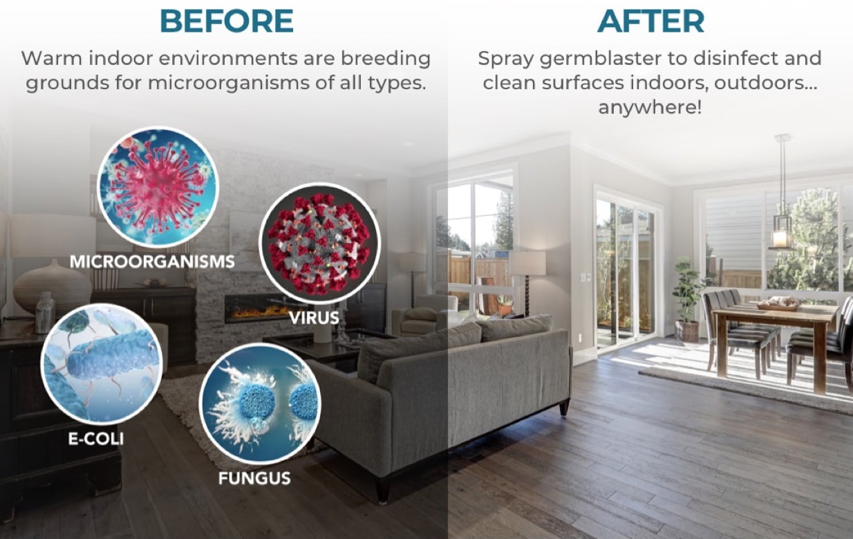germblaster creates a non-toxic, natural cleaning solution, that eventually converts back to water. Safe for you, kids, pets, and literally any surface you spray it on.